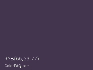 RYB 66,53,77 Color is a dark purple color and the nearest color is Ship Gray #3e3a44. Hex code #42354d and RGB value is rgb(66,53,77). In RGB color space, this color is composed of 26% red, 21% green, 30% blue, In CMYK color space, this color is composed of 14% cyan, 31% magenta, 0% yellow , 70% black , In HSL color space, this color has a hue angle of 273° , 18% saturation and 25% lightness.