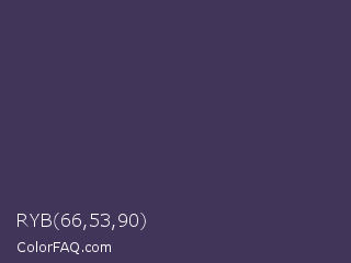 RYB 66,53,90 Color is a dark violet color and the nearest color is Gun Powder #414257. Hex code #42355a and RGB value is rgb(66,53,90). In RGB color space, this color is composed of 26% red, 21% green, 35% blue, In CMYK color space, this color is composed of 27% cyan, 41% magenta, 0% yellow , 65% black , In HSL color space, this color has a hue angle of 261° , 26% saturation and 28% lightness.