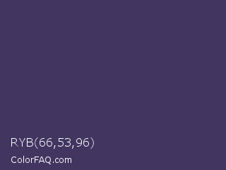 RYB 66,53,96 Color is a dark indigo color and the nearest color is Gun Powder #414257. Hex code #423560 and RGB value is rgb(66,53,96). In RGB color space, this color is composed of 26% red, 21% green, 38% blue, In CMYK color space, this color is composed of 31% cyan, 45% magenta, 0% yellow , 62% black , In HSL color space, this color has a hue angle of 258° , 29% saturation and 29% lightness.