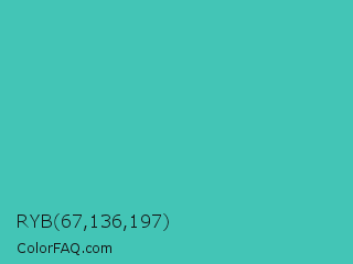 RYB 67,136,197 Color is a normal cyan color and the nearest color is Puerto Rico #3fc1aa. Hex code #43c5b6 and RGB value is rgb(67,197,182). In RGB color space, this color is composed of 26% red, 77% green, 71% blue, In CMYK color space, this color is composed of 66% cyan, 0% magenta, 8% yellow , 23% black , In HSL color space, this color has a hue angle of 173° , 53% saturation and 52% lightness.