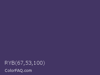 RYB 67,53,100 Color is a dark indigo color and the nearest color is Jacarta #3a2a6a. Hex code #433564 and RGB value is rgb(67,53,100). In RGB color space, this color is composed of 26% red, 21% green, 39% blue, In CMYK color space, this color is composed of 33% cyan, 47% magenta, 0% yellow , 61% black , In HSL color space, this color has a hue angle of 258° , 31% saturation and 30% lightness.