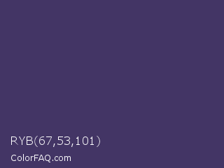 RYB 67,53,101 Color is a dark indigo color and the nearest color is Jacarta #3a2a6a. Hex code #433565 and RGB value is rgb(67,53,101). In RGB color space, this color is composed of 26% red, 21% green, 40% blue, In CMYK color space, this color is composed of 34% cyan, 48% magenta, 0% yellow , 60% black , In HSL color space, this color has a hue angle of 258° , 31% saturation and 30% lightness.