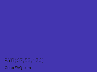 RYB 67,53,176 Color is a normal indigo color and the nearest color is Ocean Blue #4f42b5. Hex code #4335b0 and RGB value is rgb(67,53,176). In RGB color space, this color is composed of 26% red, 21% green, 69% blue, In CMYK color space, this color is composed of 62% cyan, 70% magenta, 0% yellow , 31% black , In HSL color space, this color has a hue angle of 247° , 54% saturation and 45% lightness.
