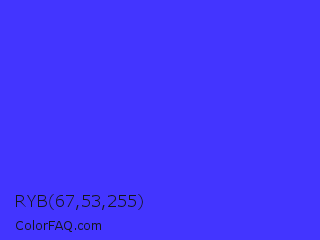 RYB 67,53,255 Color is a normal indigo color and the nearest color is Han Purple #5218fa. Hex code #4335ff and RGB value is rgb(67,53,255). In RGB color space, this color is composed of 26% red, 21% green, 100% blue, In CMYK color space, this color is composed of 74% cyan, 79% magenta, 0% yellow , 0% black , In HSL color space, this color has a hue angle of 244° , 100% saturation and 60% lightness.