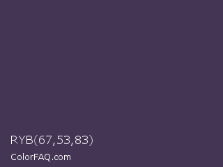 RYB 67,53,83 Color is a dark violet color and the nearest color is Gun Powder #414257. Hex code #433553 and RGB value is rgb(67,53,83). In RGB color space, this color is composed of 26% red, 21% green, 33% blue, In CMYK color space, this color is composed of 19% cyan, 36% magenta, 0% yellow , 67% black , In HSL color space, this color has a hue angle of 268° , 22% saturation and 27% lightness.