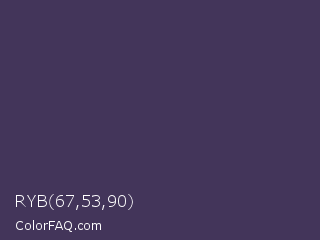 RYB 67,53,90 Color is a dark violet color and the nearest color is Gun Powder #414257. Hex code #43355a and RGB value is rgb(67,53,90). In RGB color space, this color is composed of 26% red, 21% green, 35% blue, In CMYK color space, this color is composed of 26% cyan, 41% magenta, 0% yellow , 65% black , In HSL color space, this color has a hue angle of 263° , 26% saturation and 28% lightness.