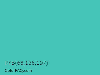 RYB 68,136,197 Color is a normal cyan color and the nearest color is Puerto Rico #3fc1aa. Hex code #44c5b8 and RGB value is rgb(68,197,184). In RGB color space, this color is composed of 27% red, 77% green, 72% blue, In CMYK color space, this color is composed of 65% cyan, 0% magenta, 7% yellow , 23% black , In HSL color space, this color has a hue angle of 174° , 53% saturation and 52% lightness.