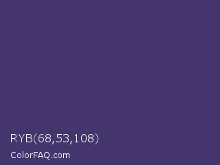 RYB 68,53,108 Color is a normal indigo color and the nearest color is Jacarta #3a2a6a. Hex code #44356c and RGB value is rgb(68,53,108). In RGB color space, this color is composed of 27% red, 21% green, 42% blue, In CMYK color space, this color is composed of 37% cyan, 51% magenta, 0% yellow , 58% black , In HSL color space, this color has a hue angle of 256° , 34% saturation and 32% lightness.