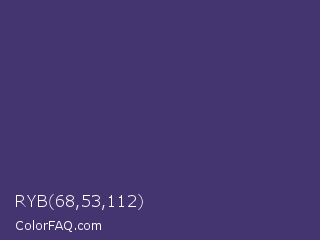 RYB 68,53,112 Color is a normal indigo color and the nearest color is Jacarta #3a2a6a. Hex code #443570 and RGB value is rgb(68,53,112). In RGB color space, this color is composed of 27% red, 21% green, 44% blue, In CMYK color space, this color is composed of 39% cyan, 53% magenta, 0% yellow , 56% black , In HSL color space, this color has a hue angle of 255° , 36% saturation and 32% lightness.