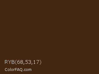 RYB 68,53,17 Color is a very dark orange color and the nearest color is Brown Derby #492615. Hex code #442611 and RGB value is rgb(68,38,17). In RGB color space, this color is composed of 27% red, 15% green, 7% blue, In CMYK color space, this color is composed of 0% cyan, 44% magenta, 75% yellow , 73% black , In HSL color space, this color has a hue angle of 25° , 60% saturation and 17% lightness.