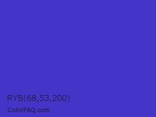 RYB 68,53,200 Color is a normal indigo color and the nearest color is Ocean Blue #4f42b5. Hex code #4435c8 and RGB value is rgb(68,53,200). In RGB color space, this color is composed of 27% red, 21% green, 78% blue, In CMYK color space, this color is composed of 66% cyan, 74% magenta, 0% yellow , 22% black , In HSL color space, this color has a hue angle of 246° , 58% saturation and 50% lightness.