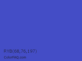 RYB 68,76,197 Color is a normal blue color and the nearest color is Ocean Blue #4f42b5. Hex code #444dc5 and RGB value is rgb(68,77,197). In RGB color space, this color is composed of 27% red, 30% green, 77% blue, In CMYK color space, this color is composed of 65% cyan, 61% magenta, 0% yellow , 23% black , In HSL color space, this color has a hue angle of 236° , 53% saturation and 52% lightness.