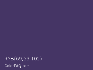 RYB 69,53,101 Color is a dark indigo color and the nearest color is Jacarta #3a2a6a. Hex code #453565 and RGB value is rgb(69,53,101). In RGB color space, this color is composed of 27% red, 21% green, 40% blue, In CMYK color space, this color is composed of 32% cyan, 48% magenta, 0% yellow , 60% black , In HSL color space, this color has a hue angle of 260° , 31% saturation and 30% lightness.
