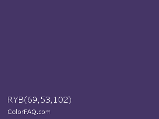 RYB 69,53,102 Color is a dark indigo color and the nearest color is Jacarta #3a2a6a. Hex code #453566 and RGB value is rgb(69,53,102). In RGB color space, this color is composed of 27% red, 21% green, 40% blue, In CMYK color space, this color is composed of 32% cyan, 48% magenta, 0% yellow , 60% black , In HSL color space, this color has a hue angle of 260° , 32% saturation and 30% lightness.