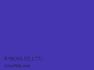 RYB 69,53,177 Color is a normal indigo color and the nearest color is Ocean Blue #4f42b5. Hex code #4535b1 and RGB value is rgb(69,53,177). In RGB color space, this color is composed of 27% red, 21% green, 69% blue, In CMYK color space, this color is composed of 61% cyan, 70% magenta, 0% yellow , 31% black , In HSL color space, this color has a hue angle of 248° , 54% saturation and 45% lightness.