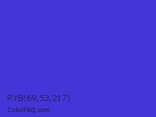 RYB 69,53,217 Color is a normal indigo color and the nearest color is Palatinate Blue #273be2. Hex code #4535d9 and RGB value is rgb(69,53,217). In RGB color space, this color is composed of 27% red, 21% green, 85% blue, In CMYK color space, this color is composed of 68% cyan, 76% magenta, 0% yellow , 15% black , In HSL color space, this color has a hue angle of 246° , 68% saturation and 53% lightness.