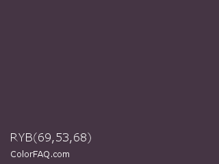 RYB 69,53,68 Color is a dark magenta color and the nearest color is Ship Gray #3e3a44. Hex code #453544 and RGB value is rgb(69,53,68). In RGB color space, this color is composed of 27% red, 21% green, 27% blue, In CMYK color space, this color is composed of 0% cyan, 23% magenta, 1% yellow , 73% black , In HSL color space, this color has a hue angle of 304° , 13% saturation and 24% lightness.