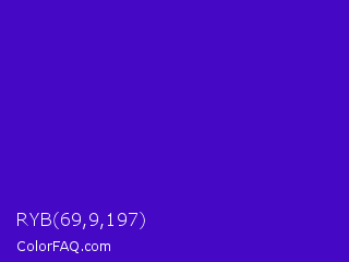 RYB 69,9,197 Color is a normal indigo color and the nearest color is Interdimensional Blue #360ccc. Hex code #4509c5 and RGB value is rgb(69,9,197). In RGB color space, this color is composed of 27% red, 4% green, 77% blue, In CMYK color space, this color is composed of 65% cyan, 95% magenta, 0% yellow , 23% black , In HSL color space, this color has a hue angle of 259° , 91% saturation and 40% lightness.
