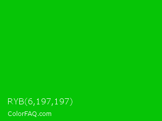 RYB 6,197,197 Color is a normal green color and the nearest color is Vivid Malachite #00cc33. Hex code #06c506 and RGB value is rgb(6,197,6). In RGB color space, this color is composed of 2% red, 77% green, 2% blue, In CMYK color space, this color is composed of 97% cyan, 0% magenta, 97% yellow , 23% black , In HSL color space, this color has a hue angle of 120° , 94% saturation and 40% lightness.