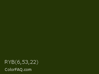 RYB 6,53,22 Color is a very dark green color and the nearest color is Turtle Green #2a380b. Hex code #253506 and RGB value is rgb(37,53,6). In RGB color space, this color is composed of 15% red, 21% green, 2% blue, In CMYK color space, this color is composed of 30% cyan, 0% magenta, 89% yellow , 79% black , In HSL color space, this color has a hue angle of 80° , 80% saturation and 12% lightness.