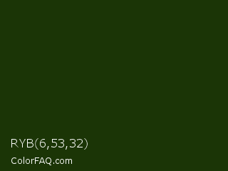 RYB 6,53,32 Color is a very dark green color and the nearest color is Palm Leaf #19330e. Hex code #1b3506 and RGB value is rgb(27,53,6). In RGB color space, this color is composed of 11% red, 21% green, 2% blue, In CMYK color space, this color is composed of 49% cyan, 0% magenta, 89% yellow , 79% black , In HSL color space, this color has a hue angle of 93° , 80% saturation and 12% lightness.