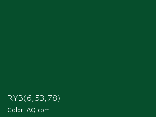 RYB 6,53,78 Color is a very dark green color and the nearest color is Sherwood Green #02402c. Hex code #064e2c and RGB value is rgb(6,78,44). In RGB color space, this color is composed of 2% red, 31% green, 17% blue, In CMYK color space, this color is composed of 92% cyan, 0% magenta, 44% yellow , 69% black , In HSL color space, this color has a hue angle of 152° , 86% saturation and 16% lightness.