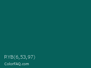 RYB 6,53,97 Color is a very dark cyan color and the nearest color is Blue Stone #016162. Hex code #06615b and RGB value is rgb(6,97,91). In RGB color space, this color is composed of 2% red, 38% green, 36% blue, In CMYK color space, this color is composed of 94% cyan, 0% magenta, 6% yellow , 62% black , In HSL color space, this color has a hue angle of 176° , 88% saturation and 20% lightness.