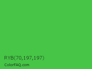 RYB 70,197,197 Color is a normal green color and the nearest color is Lime Green #32cd32. Hex code #46c546 and RGB value is rgb(70,197,70). In RGB color space, this color is composed of 27% red, 77% green, 27% blue, In CMYK color space, this color is composed of 64% cyan, 0% magenta, 64% yellow , 23% black , In HSL color space, this color has a hue angle of 120° , 52% saturation and 52% lightness.