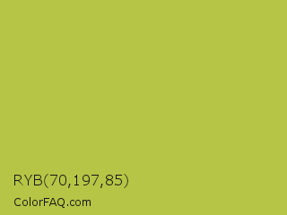 RYB 70,197,85 Color is a normal yellow color and the nearest color is Android Green #a4c639. Hex code #b6c546 and RGB value is rgb(182,197,70). In RGB color space, this color is composed of 71% red, 77% green, 27% blue, In CMYK color space, this color is composed of 8% cyan, 0% magenta, 64% yellow , 23% black , In HSL color space, this color has a hue angle of 67° , 52% saturation and 52% lightness.