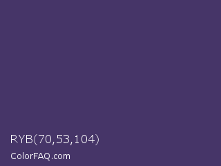 RYB 70,53,104 Color is a normal indigo color and the nearest color is Jacarta #3a2a6a. Hex code #463568 and RGB value is rgb(70,53,104). In RGB color space, this color is composed of 27% red, 21% green, 41% blue, In CMYK color space, this color is composed of 33% cyan, 49% magenta, 0% yellow , 59% black , In HSL color space, this color has a hue angle of 260° , 32% saturation and 31% lightness.