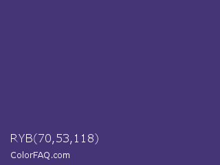 RYB 70,53,118 Color is a normal indigo color and the nearest color is Minsk #3f307f. Hex code #463576 and RGB value is rgb(70,53,118). In RGB color space, this color is composed of 27% red, 21% green, 46% blue, In CMYK color space, this color is composed of 41% cyan, 55% magenta, 0% yellow , 54% black , In HSL color space, this color has a hue angle of 256° , 38% saturation and 34% lightness.