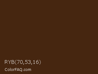 RYB 70,53,16 Color is a very dark orange color and the nearest color is Brown Derby #492615. Hex code #462610 and RGB value is rgb(70,38,16). In RGB color space, this color is composed of 27% red, 15% green, 6% blue, In CMYK color space, this color is composed of 0% cyan, 46% magenta, 77% yellow , 73% black , In HSL color space, this color has a hue angle of 24° , 63% saturation and 17% lightness.