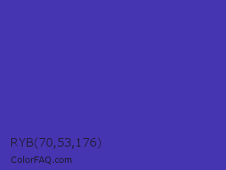 RYB 70,53,176 Color is a normal indigo color and the nearest color is Ocean Blue #4f42b5. Hex code #4635b0 and RGB value is rgb(70,53,176). In RGB color space, this color is composed of 27% red, 21% green, 69% blue, In CMYK color space, this color is composed of 60% cyan, 70% magenta, 0% yellow , 31% black , In HSL color space, this color has a hue angle of 248° , 54% saturation and 45% lightness.