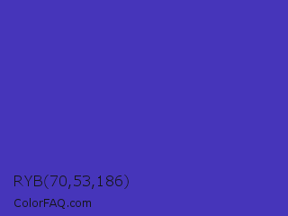 RYB 70,53,186 Color is a normal indigo color and the nearest color is Ocean Blue #4f42b5. Hex code #4635ba and RGB value is rgb(70,53,186). In RGB color space, this color is composed of 27% red, 21% green, 73% blue, In CMYK color space, this color is composed of 62% cyan, 72% magenta, 0% yellow , 27% black , In HSL color space, this color has a hue angle of 248° , 56% saturation and 47% lightness.