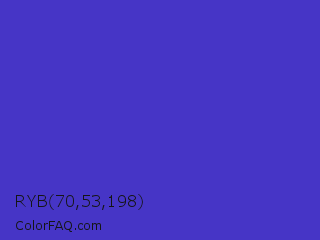 RYB 70,53,198 Color is a normal indigo color and the nearest color is Ocean Blue #4f42b5. Hex code #4635c6 and RGB value is rgb(70,53,198). In RGB color space, this color is composed of 27% red, 21% green, 78% blue, In CMYK color space, this color is composed of 65% cyan, 73% magenta, 0% yellow , 22% black , In HSL color space, this color has a hue angle of 247° , 58% saturation and 49% lightness.