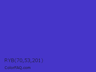 RYB 70,53,201 Color is a normal indigo color and the nearest color is Ocean Blue #4f42b5. Hex code #4635c9 and RGB value is rgb(70,53,201). In RGB color space, this color is composed of 27% red, 21% green, 79% blue, In CMYK color space, this color is composed of 65% cyan, 74% magenta, 0% yellow , 21% black , In HSL color space, this color has a hue angle of 247° , 58% saturation and 50% lightness.
