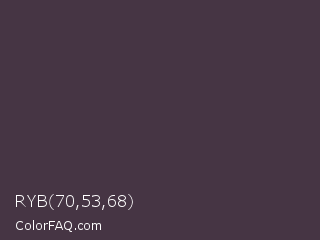 RYB 70,53,68 Color is a dark magenta color and the nearest color is Ship Gray #3e3a44. Hex code #463544 and RGB value is rgb(70,53,68). In RGB color space, this color is composed of 27% red, 21% green, 27% blue, In CMYK color space, this color is composed of 0% cyan, 24% magenta, 3% yellow , 73% black , In HSL color space, this color has a hue angle of 307° , 14% saturation and 24% lightness.