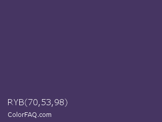 RYB 70,53,98 Color is a dark violet color and the nearest color is Bossanova #4e2a5a. Hex code #463562 and RGB value is rgb(70,53,98). In RGB color space, this color is composed of 27% red, 21% green, 38% blue, In CMYK color space, this color is composed of 29% cyan, 46% magenta, 0% yellow , 62% black , In HSL color space, this color has a hue angle of 263° , 30% saturation and 30% lightness.