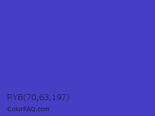RYB 70,63,197 Color is a normal indigo color and the nearest color is Ocean Blue #4f42b5. Hex code #463fc5 and RGB value is rgb(70,63,197). In RGB color space, this color is composed of 27% red, 25% green, 77% blue, In CMYK color space, this color is composed of 64% cyan, 68% magenta, 0% yellow , 23% black , In HSL color space, this color has a hue angle of 243° , 54% saturation and 51% lightness.