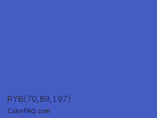 RYB 70,89,197 Color is a normal blue color and the nearest color is Indigo #4f69c6. Hex code #465cc5 and RGB value is rgb(70,92,197). In RGB color space, this color is composed of 27% red, 36% green, 77% blue, In CMYK color space, this color is composed of 64% cyan, 53% magenta, 0% yellow , 23% black , In HSL color space, this color has a hue angle of 230° , 52% saturation and 52% lightness.