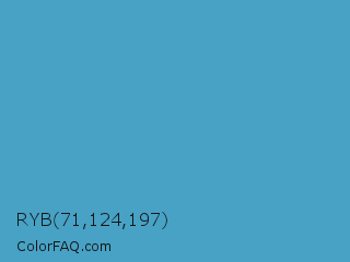 RYB 71,124,197 Color is a normal blue color and the nearest color is Maximum Blue #47abcc. Hex code #47a2c5 and RGB value is rgb(71,162,197). In RGB color space, this color is composed of 28% red, 64% green, 77% blue, In CMYK color space, this color is composed of 64% cyan, 18% magenta, 0% yellow , 23% black , In HSL color space, this color has a hue angle of 197° , 52% saturation and 53% lightness.