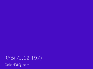 RYB 71,12,197 Color is a normal indigo color and the nearest color is Interdimensional Blue #360ccc. Hex code #470cc5 and RGB value is rgb(71,12,197). In RGB color space, this color is composed of 28% red, 5% green, 77% blue, In CMYK color space, this color is composed of 64% cyan, 94% magenta, 0% yellow , 23% black , In HSL color space, this color has a hue angle of 259° , 89% saturation and 41% lightness.