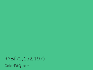 RYB 71,152,197 Color is a normal green color and the nearest color is Ocean Green #48bf91. Hex code #47c58d and RGB value is rgb(71,197,141). In RGB color space, this color is composed of 28% red, 77% green, 55% blue, In CMYK color space, this color is composed of 64% cyan, 0% magenta, 28% yellow , 23% black , In HSL color space, this color has a hue angle of 153° , 52% saturation and 53% lightness.