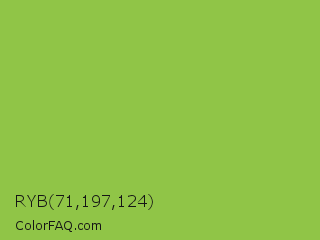 RYB 71,197,124 Color is a normal green color and the nearest color is Android Green #a4c639. Hex code #90c547 and RGB value is rgb(144,197,71). In RGB color space, this color is composed of 56% red, 77% green, 28% blue, In CMYK color space, this color is composed of 27% cyan, 0% magenta, 64% yellow , 23% black , In HSL color space, this color has a hue angle of 85° , 52% saturation and 53% lightness.