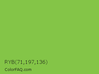 RYB 71,197,136 Color is a normal green color and the nearest color is Sushi #87ab39. Hex code #84c547 and RGB value is rgb(132,197,71). In RGB color space, this color is composed of 52% red, 77% green, 28% blue, In CMYK color space, this color is composed of 33% cyan, 0% magenta, 64% yellow , 23% black , In HSL color space, this color has a hue angle of 91° , 52% saturation and 53% lightness.