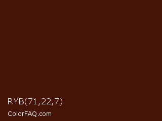 RYB 71,22,7 Color is a very dark red color and the nearest color is Van Cleef #49170c. Hex code #471307 and RGB value is rgb(71,19,7). In RGB color space, this color is composed of 28% red, 7% green, 3% blue, In CMYK color space, this color is composed of 0% cyan, 73% magenta, 90% yellow , 72% black , In HSL color space, this color has a hue angle of 11° , 82% saturation and 15% lightness.