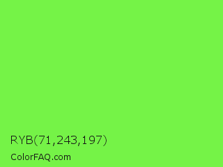 RYB 71,243,197 Color is a light green color and the nearest color is Kiwi #8ee53f. Hex code #75f347 and RGB value is rgb(117,243,71). In RGB color space, this color is composed of 46% red, 95% green, 28% blue, In CMYK color space, this color is composed of 52% cyan, 0% magenta, 71% yellow , 5% black , In HSL color space, this color has a hue angle of 104° , 88% saturation and 62% lightness.