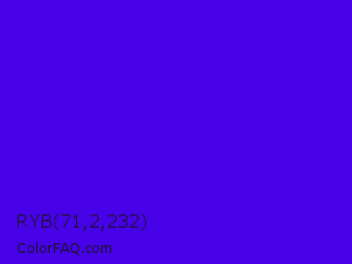 RYB 71,2,232 Color is a normal indigo color and the nearest color is Electric Ultramarine #3f00ff. Hex code #4702e8 and RGB value is rgb(71,2,232). In RGB color space, this color is composed of 28% red, 1% green, 91% blue, In CMYK color space, this color is composed of 69% cyan, 99% magenta, 0% yellow , 9% black , In HSL color space, this color has a hue angle of 258° , 98% saturation and 46% lightness.