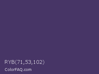 RYB 71,53,102 Color is a dark violet color and the nearest color is Jacarta #3a2a6a. Hex code #473566 and RGB value is rgb(71,53,102). In RGB color space, this color is composed of 28% red, 21% green, 40% blue, In CMYK color space, this color is composed of 30% cyan, 48% magenta, 0% yellow , 60% black , In HSL color space, this color has a hue angle of 262° , 32% saturation and 30% lightness.