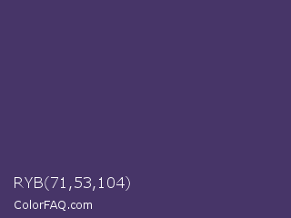 RYB 71,53,104 Color is a normal violet color and the nearest color is Jacarta #3a2a6a. Hex code #473568 and RGB value is rgb(71,53,104). In RGB color space, this color is composed of 28% red, 21% green, 41% blue, In CMYK color space, this color is composed of 32% cyan, 49% magenta, 0% yellow , 59% black , In HSL color space, this color has a hue angle of 261° , 32% saturation and 31% lightness.